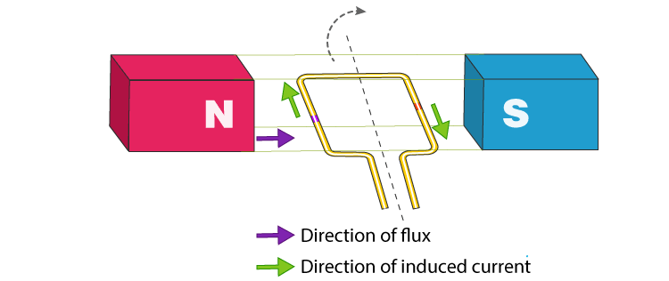 In the above figure, A rectangular conductor width sides are placed in between a magnetic field. When the rectangular conductor rotates in between magnetics, it cuts the magnetic field thereby causing the Electromagnetic field (e m f).