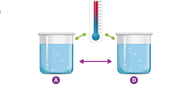 Consider two cups A and B, with boiling water. When a thermometer is placed in cup A, it gets warmed up by the water until it reads 100 °C. When it reads 100 °C, we say that the thermometer is in equilibrium with cup A. When we move the thermometer to cup B to read the temperature, it continues to read 100 °C. The thermometer is also in equilibrium with cup B. By keeping in mind the zeroth law of thermodynamics, we can conclude that cup A and cup B are in equilibrium with each other.